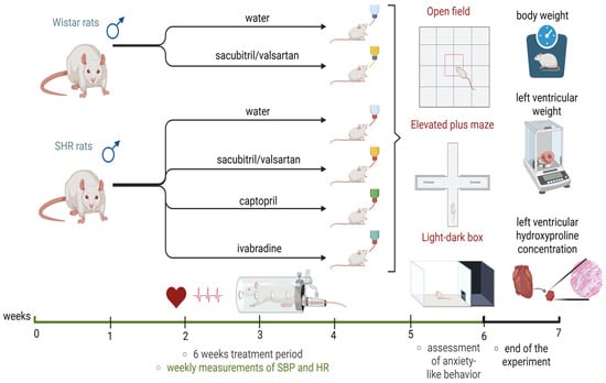 Figure 10. Experimental timeline (created in https://BioRender.com). SHRs—spontaneously hypertensive rats; SBP—systolic blood pressure; HR—heart rate.
