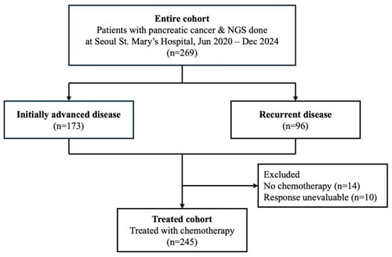 A total of 269 patients with pathologically confirmed advanced pancreatic cancer who underwent next-generation sequencing (NGS) between June 2020 and December 2024 at Seoul St. Mary’s Hospital were included in this retrospective study (Figure 1).