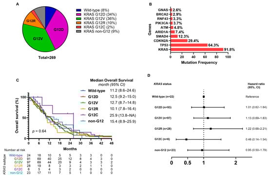 Among the 269 patients, 247 (92%) harbored KRAS mutations. The most prevalent subtype was G12V (96 patients, 36%), followed by G12D (93 patients, 34%), G12R (28 patients, 10%), and non-G12 codon mutations (23 patients, 9%) (Figure 2A). Two patients had co-occurring G12D and non-G12 mutations. G12C mutations were identified in 6 patients, representing 2% of the total cohort. The median follow-up duration for the entire cohort was 9.9 months (95% CI, 8.9–11.9), and 218 patients (81.0%) had died at the time of analysis. The median overall survival (OS) for the entire cohort was 12.5 months (95% CI, 9.9–13.8). OS according to KRAS mutation subtypes revealed no statistically significant difference across groups (p = 0.64, Figure 2C). The median OS was 11.2 months (95% CI, 8.6–24.6) in patients with wild-type KRAS, 12.5 months (95% CI, 9.2–15.0) in those with G12D mutations, 12.7 months (95% CI, 8.7–14.8) in G12V, 10.1 months (95% CI, 7.8–16.4) in G12R, and 15.4 months (95% CI, 8.9–25.9) in non-G12 mutations. The G12C subgroup showed a numerically longer median OS of 25.9 months (95% CI, 13.8–not reached), though the sample size was small and the difference was not statistically significant. Compared with patients carrying wild-type KRAS, none of the specific KRAS subtypes showed a statistically significant difference in OS (Figure 2D).