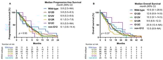 Kaplan–Meier curves for progression-free survival and overall survival by KRAS mutation subtype in the treated cohort. (A) Progression-free survival (PFS) and (B) overall survival (OS) according to KRAS mutation subtype in patients who received systemic treatment. No statistically significant differences in PFS (p = 0.93) or OS (p = 0.37) were observed among the subgroups.