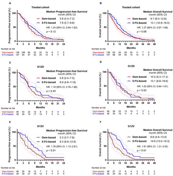 In the overall treated cohort, patients receiving fluorouracil-based chemotherapy had a numerically longer median PFS of 7.8 months (95% CI, 5.7–9.6) compared with 5.8 months (95% CI, 5.3–7.2) for those receiving gemcitabine-based regimens, although the difference was not statistically significant (p = 0.12; Figure 5A). Median OS was 13.1 months (95% CI, 10.8–16.0) with fluorouracil-based therapy versus 9.7 months (95% CI, 8.0–12.6) with gemcitabine-based therapy (p = 0.08; Figure 5B). No significant differences were observed in ORR (32.7% vs. 37.7%, p = 0.50) or DCR (86.0% vs. 84.8%, p = 0.86) between the two regimens (Table S3). In the G12D subgroup, survival outcomes were similar between regimens. Median PFS was 6.9 months (95% CI, 4.8–11.8) with fluorouracil-based therapy and 5.8 months (95% CI, 5.4–7.5) with gemcitabine-based therapy (p = 0.45; Figure 5C), while median OS was 13.1 months (95% CI, 8.8–19.6) and 10.5 months (95% CI, 8.3–17.2), respectively (p = 0.93; Figure 5D). In the G12V subgroup, patients treated with gemcitabine-based regimens had a significantly inferior median PFS of 5.3 months (95% CI, 3.7–7.6) compared with 8.3 months (95% CI, 6.9–12.8) for those receiving fluorouracil-based regimens (HR = 1.78; 95% CI, 1.13–2.81; p = 0.01; Figure 5E). Median OS was also shorter with gemcitabine-based therapy (6.6 months [95% CI, 4.9–13.0]) than with fluorouracil-based therapy (14.8 months [95% CI, 13.0–19.3]) (HR = 1.91; 95% CI, 1.21–3.02; p = 0.01; Figure 5F). Although ORR (38.5% vs. 30.6%) and DCR (92.3% vs. 79.6%) were numerically higher with fluorouracil-based therapy, these differences were not statistically significant.