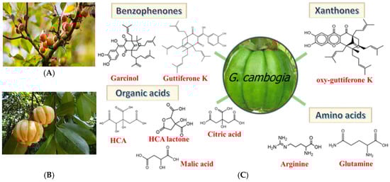 (A) Garcinia Indica, (B) Garcinia Cambogia, (C) chemical constituents of Garcinia fruit [6].