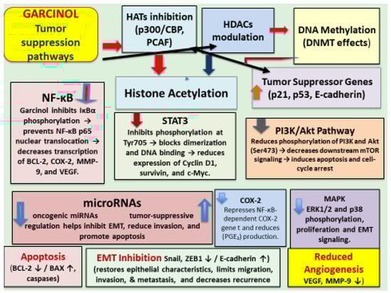 Schematic illustration of the multi-targeted tumor-suppressive mechanisms of garcinol across epigenetic, transcriptional, and signaling axes.
