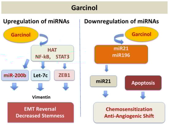 Garcinol upregulates tumor suppressor miRNAs and downregulates oncogenic miRNAs.