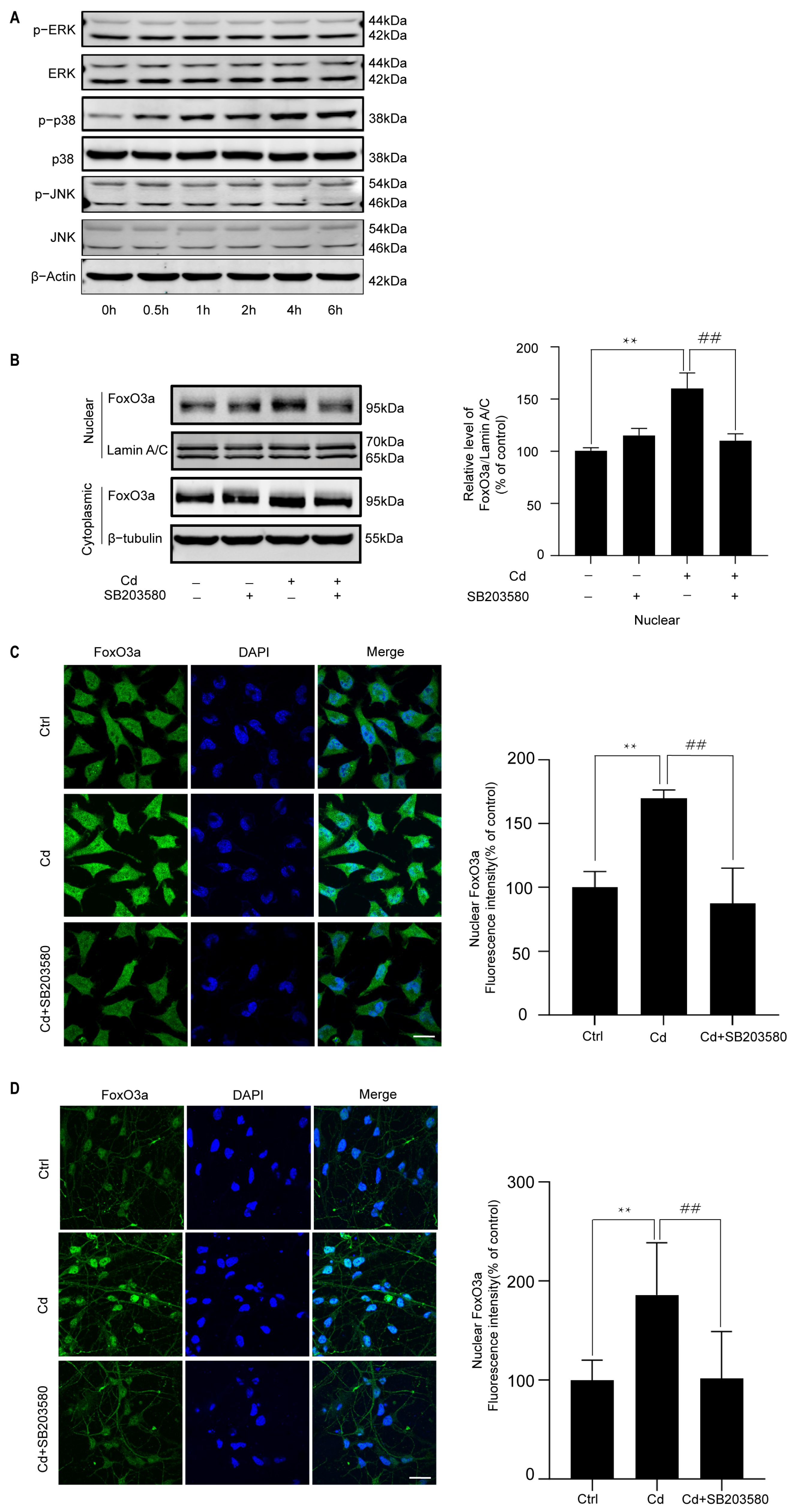 Chicago/Turabian StyleLin, Tianji, Shijuan Ruan, Xinyu Liu, Fangfei Li, Hangqian Zhang, Fei Zou, and Bin Wang. 2025. "p38 Regulates FoxO3a-Mediated SOD2 Expression to Prevent Cd-Induced Oxidative Stress in Neuronal Cells" International Journal of Molecular Sciences 26, no. 22: 10919. https://doi.org/10.3390/ijms262210919