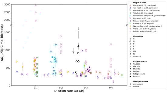 To broaden our thermodynamic understanding of microbial growth to non-carbonlimited conditions, we surveyed the literature reporting both carbon- and non-carbon-limited growth under comparable experimental conditions. We limited our search to articles where carbon-limited or anabolic-limited continuous chemostat conditions were used and gas exchange, nutrient consumption, and production formation rates were systematically measured to allow for reconstruction of a balanced growth equation. In total, we selected 10 articles that fulfilled these criteria by studying various yeasts, including Saccharomyces cerevisiae, Cyberlindnera jadinii, and Pichia kluyveri [,,,,,,]; E. coli []; Klebsiella aerogenes []; and Klebsiella pneumoniae [,]. In addition, we included one study on E. coli, in which gas exchange was not measured, to also include iron limitation in our analysis [,]. To obtain the thermodynamic characteristics, for each experiment, we first determined a balanced macrochemical growth equation that best fit the experimentally determined exchange fluxes of nutrients and metabolic products and the set dilution (growth) rate. This fitting was necessary because the carbon recovery coefficients diverged from 100%. This equation was normalized to the production of 1 C-mol biomass, and the thermodynamic characteristics were calculated as described in Section 4 and Box 1. Our strategy extends previous approaches [,] by providing an estimate of the thermodynamics of catabolism normalized per unit of biomass formed and including non-carbon or non-energy limitations in our research [,].