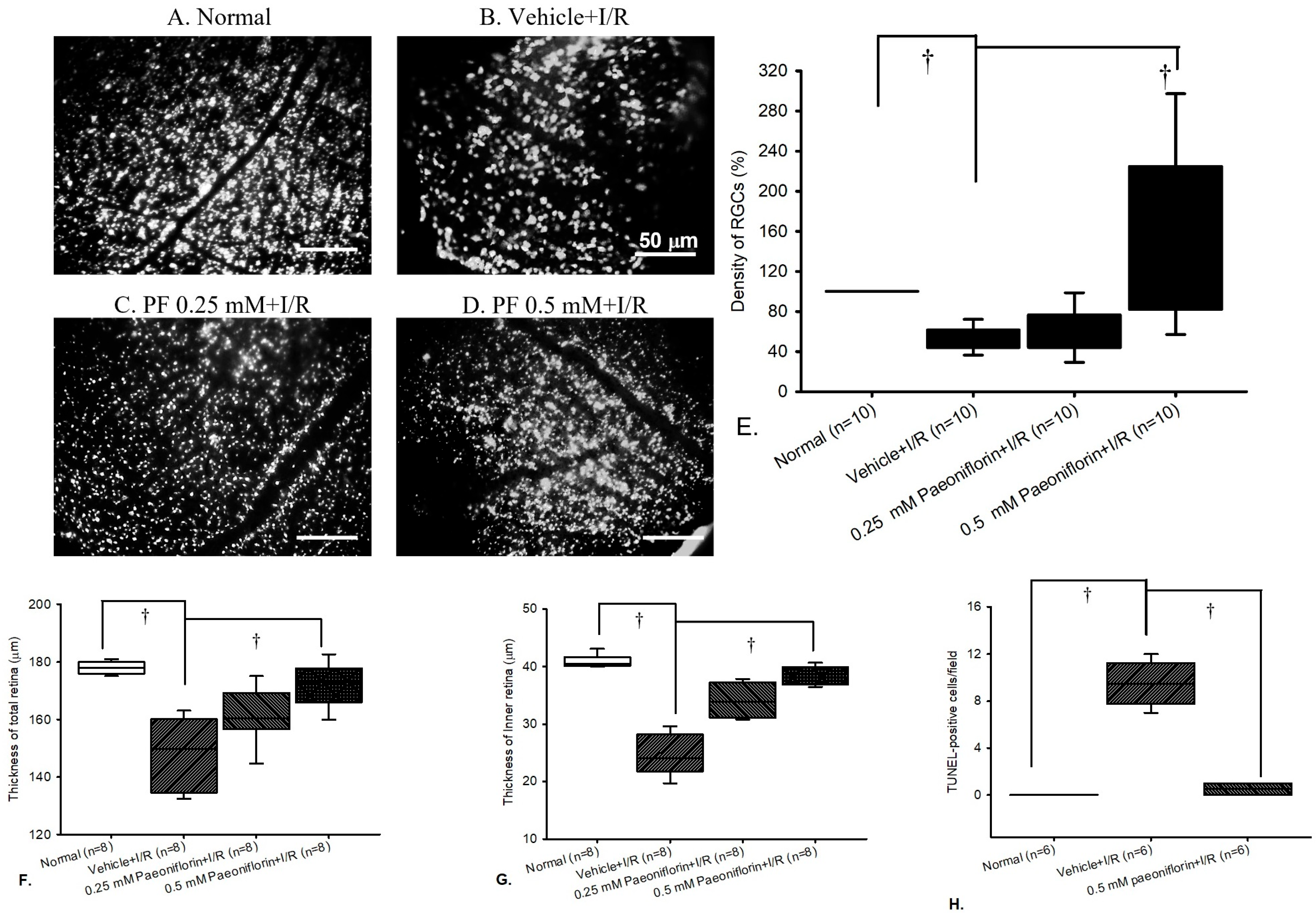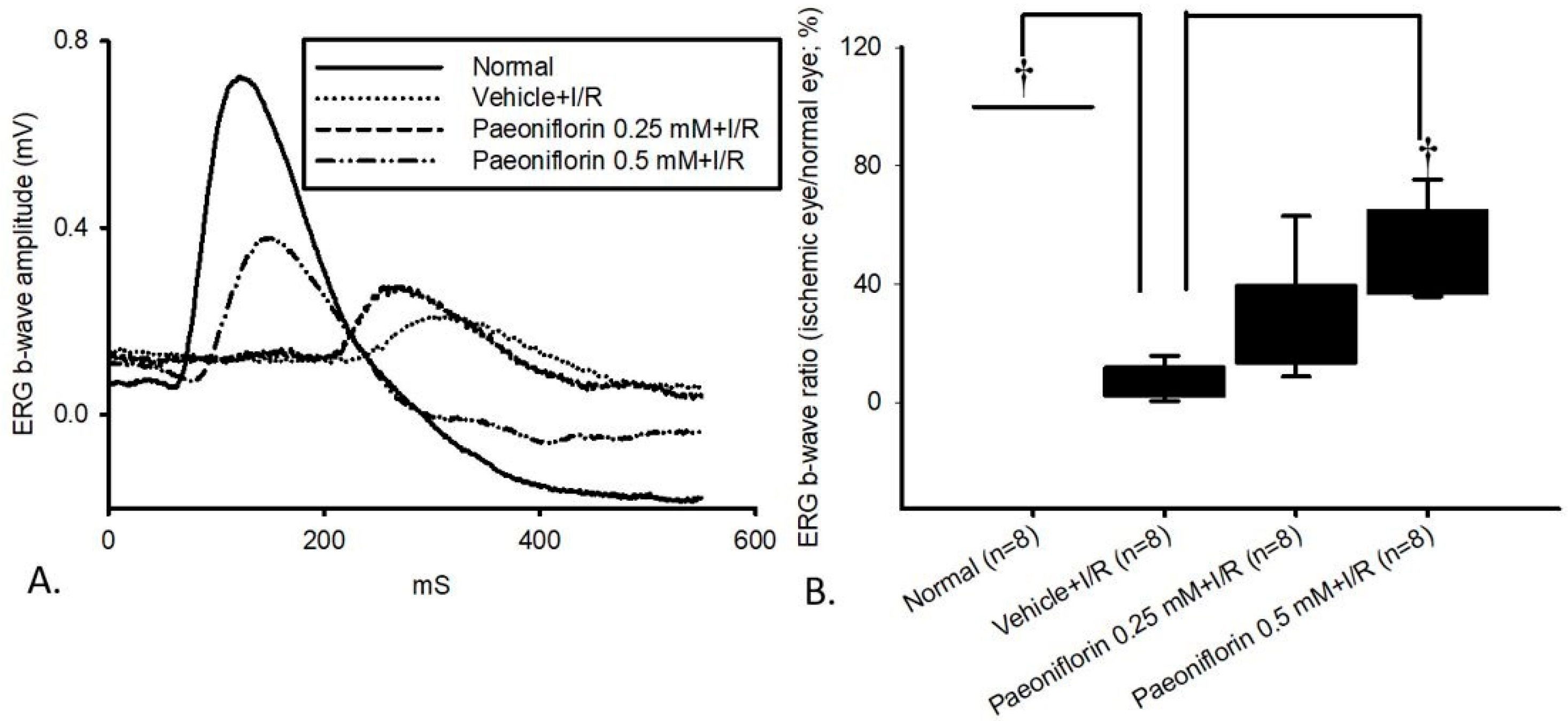 2.3. Electroretinogram: The Effect of Pre-Ischemic Treatment Paeoniflorin on Ischemic–Reperfusion Injury