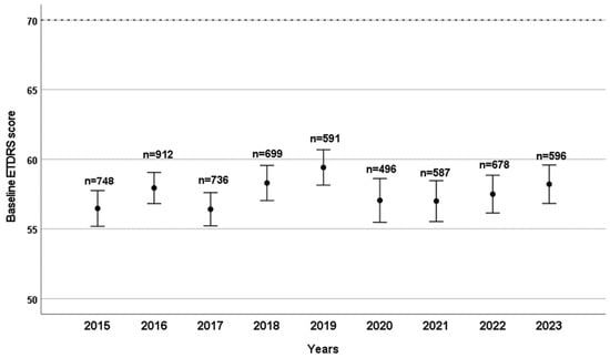 Baseline ETDRS visual acuity scores are shown by year, with the number of patients (n) who received their first intravitreal anti-VEGF treatment indicated for each year. Bars represent the 95% confidence interval of the mean score.