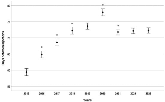 Mean time interval (days) between consecutive intravitreal anti-VEGF injections by year. Error bars represent 95% confidence intervals for the mean. * p < 0.001 compared to the previous year.