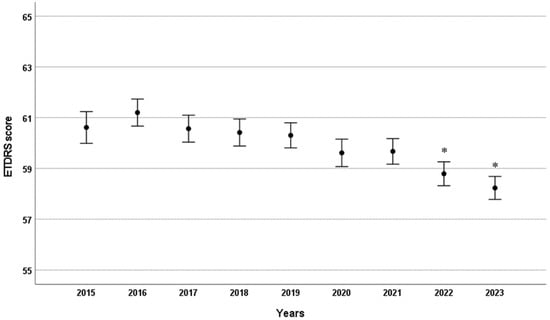 Mean ETDRS visual acuity scores by year in patients receiving intravitreal anti-VEGF injections. Error bars indicate the 95% confidence interval for the mean. * p < 0.001 compared to 2015.
