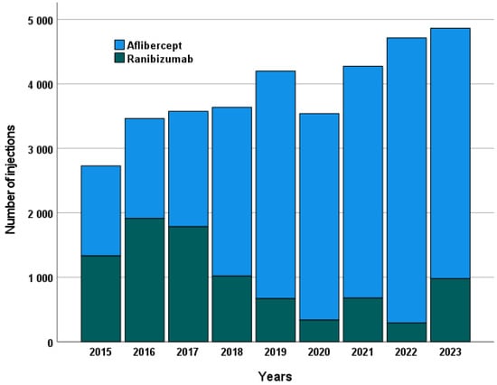 Annual number of intravitreal injections administered for each anti-VEGF agent, illustrating treatment frequency trends over the study period. The figure shows the total number of injections per year separately for ranibizumab and aflibercept, reflecting changes in treatment practice and adoption patterns of the two agents.