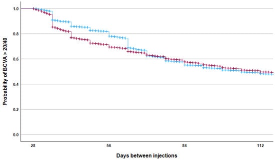 However, Kaplan–Meier analysis (Figure 5) showed that aflibercept treatment was associated with a greater probability of maintaining BCVA ≥ 70 ETDRS letters, especially when the interval between injections was between 35 and 70 days. When analyzing data from patients with ≤120 days between consecutive visits, those receiving aflibercept remained significantly more likely to achieve BCVA ≥ 70 ETDRS letters at the next visit, even after adjusting for baseline BCVA and the inter-visit interval (OR: 1.10, 95% CI: 1.05–1.15, p < 0.001). In the clinically relevant 4–12-week window, aflibercept demonstrated a clear advantage in maintaining BCVA ≥ 70 ETDRS letters at the 6–8-week treatment interval (Figure 6).