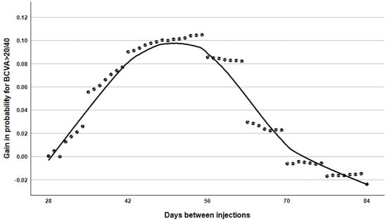 As the database we used did not contain retinal thickness data, we were unable to study the relationship between morphological and functional changes. Although contrast sensitivity and microperimetry testing also show significant correlations with activities of daily living task tests performance in AMD patients, monocular BCVA remains the most common measure of visual function [,]. The most prevalent functional endpoint in ophthalmic clinical trials is the alteration in BCVA, with secondary functional endpoints being 5-, 10-, and 15-letter gainers and losers, as well as meaningful VA levels such as 20/40 and 20/200 []. The BCVA threshold of 20/40 is the most universally used visual threshold test for obtaining a driver’s licence, yet the BCVA requirements vary from country to country [].