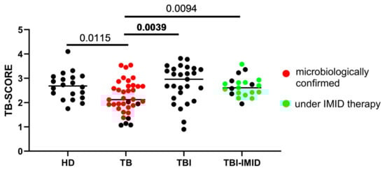 Importantly, we observed that the IMID comorbidity did not significantly affect TB-SCORE values of TBI with respect to those of TB patients, nor did the estimated timing of Mtb exposure (i.e., remote vs. recent). This allowed us to group TBI and TBI-IMID individuals, reinforcing the robustness of the TB-SCORE in identifying TB patients, regardless of the immunological state of the diverse populations. These findings are particularly relevant for TBI-IMID, given the increased risk of TB reactivation in patients undergoing immunosuppressive therapy, especially those treated with TNF-α inhibitors [].