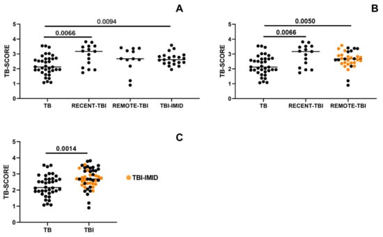 Since neither the timing of Mtb exposure nor the presence of IMID significantly impacted TB-SCORE values, individuals with TBI and TBI-IMID were combined into a single cohort. This analysis confirmed that TBI individuals exhibited a significantly higher TB-SCORE than TB patients (p = 0.0014; Figure 2C).