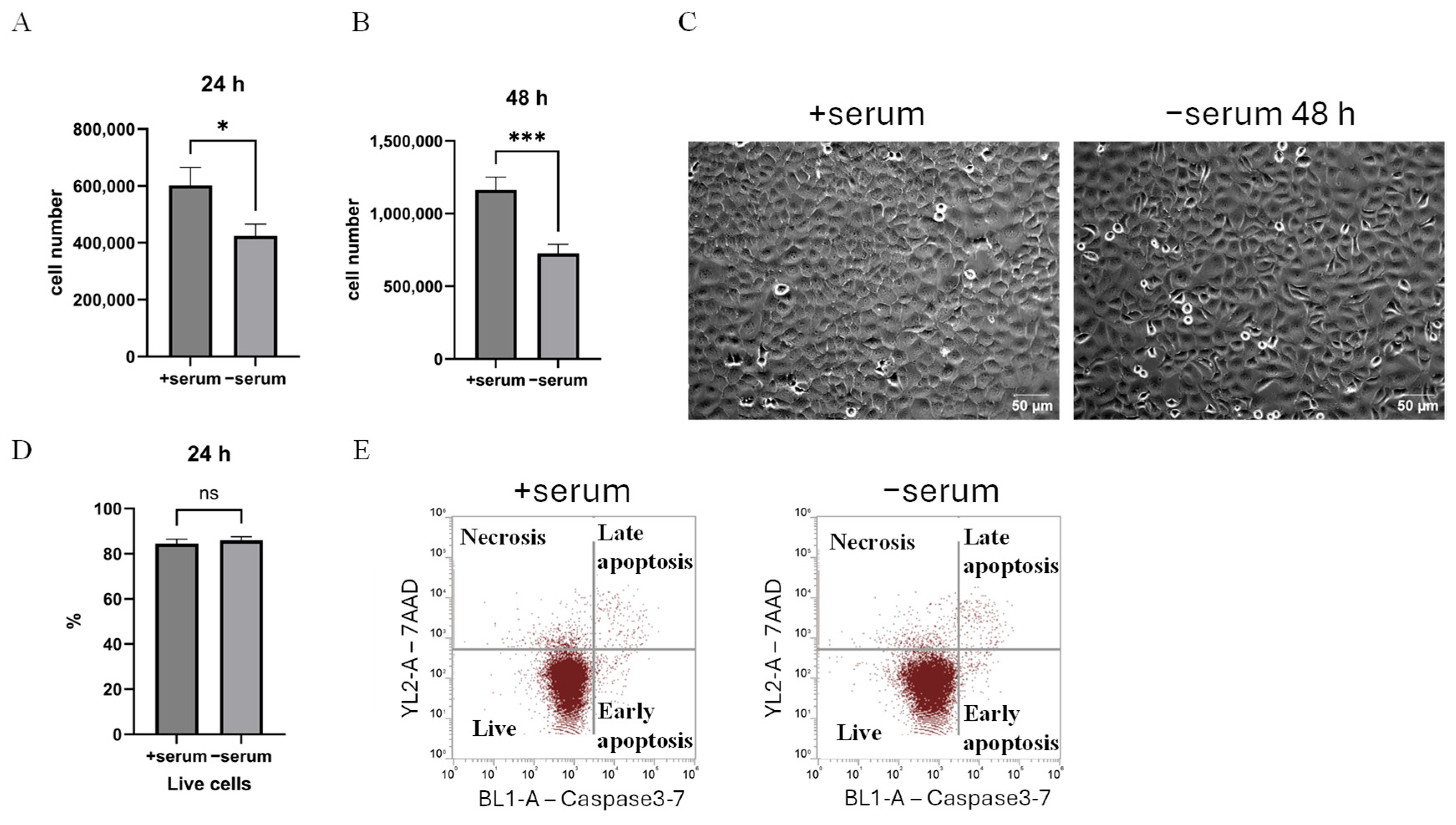 2.1. Serum Deprivation of Cancer Cells Reduces Proliferation but Does Not Induce Apoptosis