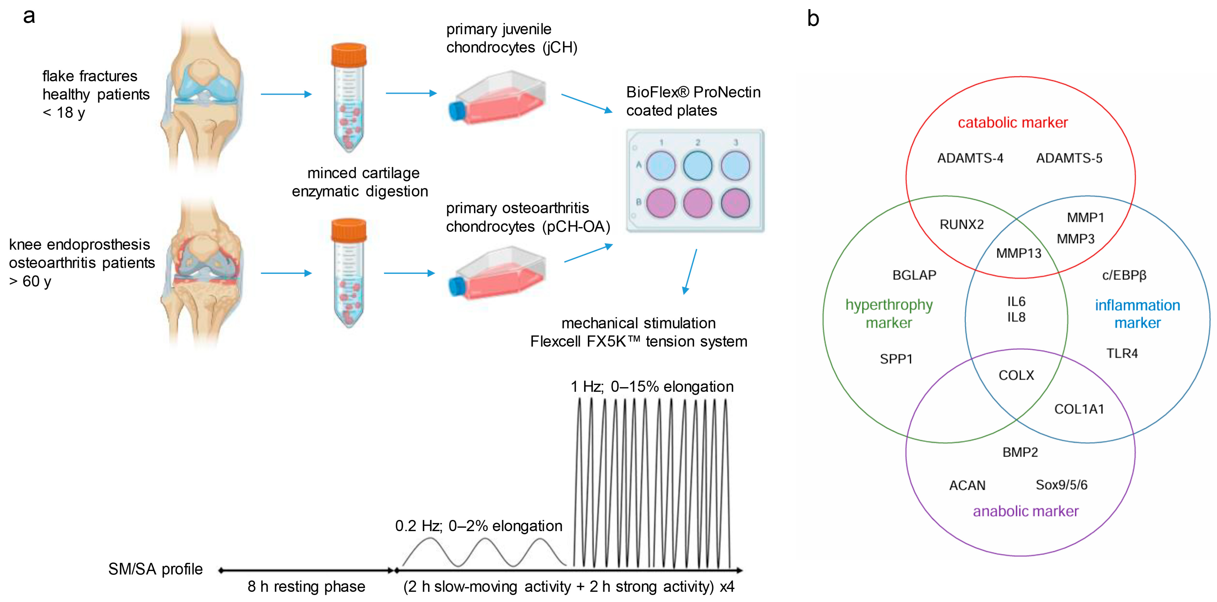 - Huang, J.; Ballou, L.R.; Hasty, K.A. Cyclic equibiaxial tensile strain induces both anabolic and catabolic responses in articular chondrocytes. Gene 2007, 404, 101–109. [Google Scholar] [CrossRef] [PubMed]
