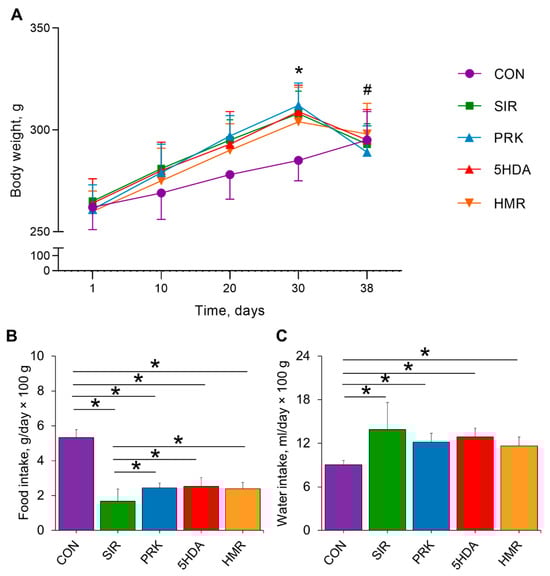 There were no differences in body weight between groups at the beginning of the experiment. At the 30th day, animal body weight was significantly higher in the SIR, PRK, 5HDA, and HMR groups compared to the CON group (p < 0.05; Figure 1A). Induction of CIC in the SIR, PRK, 5HDA, and HMR groups resulted in appreciably lower body weight on the 38th day in comparison to the 30th day (p < 0.05). Average food intake from the 30th to 38th day of the experiment has been found to be significantly lower in the SIR, PRK, 5HDA, and HMR groups compared to the CON group (p < 0.05; Figure 1B). At the same time, food intake was higher in the PRK, 5HDA, and HMR groups in comparison to the SIR group (p < 0.05). Average water intake from the 30th to 38th day of the experiment was higher in the SIR, PRK, 5HDA, and HMR groups compared to the CON group (p < 0.05; Figure 1C).