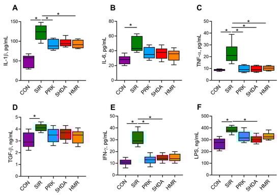 Systemic inflammation in the SIR group resulted in significantly elevated serum levels of IL-1β, IL-6, TNF-α, TGF-β, IFN-γ, and LPS compared to the CON group (p < 0.05; Figure 2). Probiotic treatment resulted in smaller IL-1β levels (p < 0.05 for PRK and HMR groups vs. SIR group). Administration of probiotics in the PRK, 5HDA, and HMR groups caused normalization of TNF-α levels (p < 0.05 for the PRK, 5HDA, and HMR groups vs. the SIR group). In the PRK and 5HDA groups, IFN-γ levels were smaller compared to the SIR group (p < 0.05) and were not different from those in the CON group. Lower LPS level compared to the SIR group was observed in the 5HDA group only (p < 0.05 vs. the SIR group).