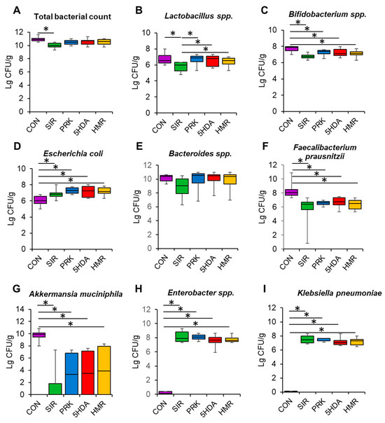Total bacterial count was significantly lower in the SIR group than in the CON group (p < 0.05, Figure 3A). The count of Lactobacillus spp. was lower in the SIR group compared to the CON group (p < 0.05, Figure 3B). Probiotic treatment restored Lactobacillus spp. count to normal values (p < 0.05, Figure 3B). Additionally, Bifidobacterium spp. counts were found to be reduced in all groups relative to the CON group (p < 0.05, Figure 3C). The animals in the SIR, PRK, 5HDA, and HMR groups had a higher count of E. coli than those in the CON group did (p < 0.05, Figure 3D). Bacteriodes spp. count was not different among groups (p > 0.05, Figure 3E). The count of Faecalibacterium prausnitzii was significantly reduced in the SIR, PRK, 5HDA, and HMR groups versus the CON group (p < 0.05, Figure 3F). Akkermansia muciniphila count was reduced in all the groups treated with probiotics as compared to the CON group (p < 0.05, Figure 3G). Enterobacter spp. and Klebsiella pneumoniae populations were elevated in the SIR, PRK, 5HDA, and HMR groups compared to the CON group (p < 0.05, Figure 3H,I).