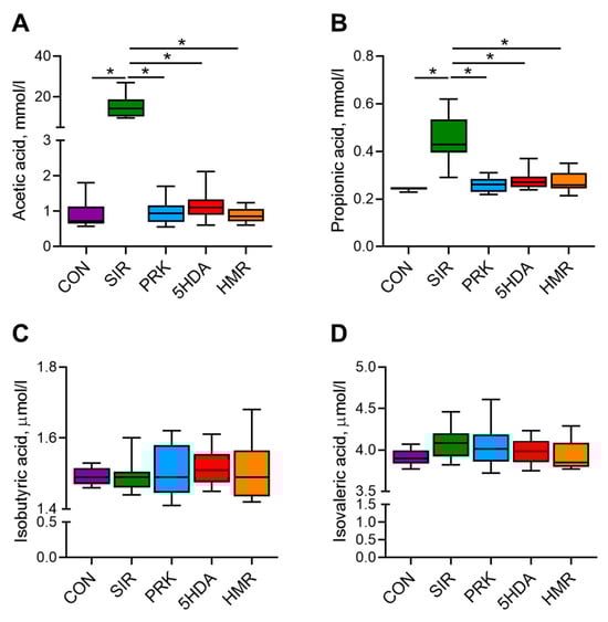 Serum levels of acetic, propionic, isobutyric, and isovaleric SCFAs at the end of the experiment are shown in Figure 4. Serum acetate and propionate levels were significantly higher in the SIR group in comparison with the CON group (p < 0.05, Figure 4A,B). In the PRK, 5-HAD, and HMR groups, acetate and propionate concentrations were significantly lower than in the SIR group (p < 0.05). The levels of isobutiric and isovaleric acids were not different among groups (Figure 4C,D).