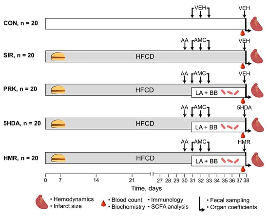 The animals were randomly assigned into one of the following five groups (Figure 6): (1) control (CON, n = 20, each rat received intragastric and intraperitoneal administrations of vehicles in volumes equivalent to those in major treatment groups); (2) systemic inflammatory response (SIR, n = 20, one day after CIC induction, the rats with DIO received intragastric administration of amoxicillin (15 mg), metronidazole (15 mg), and clarithromycin (15 mg) mixture suspended in 1 mL of phosphate buffer once per day for 3 consecutive days); (3) probiotic treatment (PRK, n = 20, the rats were treated similarly to SIR group but were additionally daily dosed with a mixture of lyophilized LA-5 and BB-12 at a dose of 1.2 × 108 colony-forming unit (CFU)/mL suspended in 1 mL of phosphate buffer for 7 days starting on the next day after CIC induction); (4) mKATP blockade with 5-hydroxydecanoate (5-HDA, n = 20, the rats were treated similarly to PRK group but additionally received intraperitoneal injection of 5-HDA dissolved in 0.2 mL of phosphate buffer at a dose of 5 mg/kg 20 min prior to heart isolation) [60]; (5) sKATP blockade with HMR 1098 (HMR, n = 20, the rats were treated similarly to previous group but instead of 5-HDA received intraperitoneal injection of HMR 1098 dissolved in 0.2 mL of phosphate buffer at a dose of 10 mg/kg) [61].