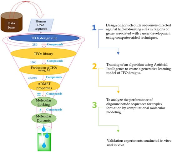 Over the past 40 years, the development of oligonucleotides (ONs) has undergone significant improvement []. However, only 10 out of 1000 compounds are optimized enough to be evaluated in preclinical trials, a complex approval process that can take up to 15 years []. Triplex-forming oligonucleotides (TFOs), a breakthrough in drug development, are synthetic single-stranded DNA molecules that can form triplexes by binding to the major groove in specific regions of the DNA duplex [], offering a promising future for drug design [].