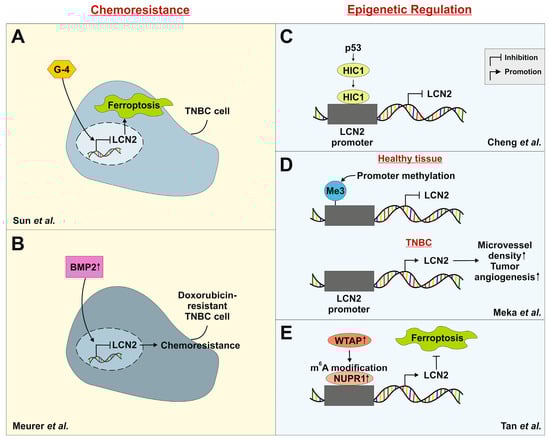 Schematic representation of the influence of LCN2 in chemoresistance and its epigenetic regulation. (A) Treatment with G-4, a derivative of roscovitine (a cyclin-dependent kinase inhibitor), reduces cell viability, proliferation, and migration of TNBC cells in vitro and in vivo. LCN2 expression is downregulated in treated cells, leading to ferroptosis []. (B) LCN2 is downregulated in doxorubicin-resistant TNBC cells, accompanied by increased bone morphogenetic protein 2 (BMP2) expression. BMP2 suppresses LCN2 expression. Thus, LCN2 downregulation appears to be a hallmark of acquired chemoresistance []. (C) LCN2 is regulated downstream of hypermethylated in cancer (HIC1). HIC1 is transcriptionally controlled by p53 and is frequently silenced in TNBC, contributing to increased invasiveness []. (D) Promoter methylation is an important mechanism of gene regulation. The LCN2 promoter is unmethylated in 9 out of 10 TNBC patient samples, leading to increased LCN2 expression and resulting in higher microvessel density and tumor angiogenesis []. (E) LCN2 is positively regulated via the WT1-associating protein (WTAP)/NUPR1 axis. WTAP enhances nuclear protein 1 (NUPR1) through m6A modification, and binding of this complex to the LCN2 promoter increases LCN2 expression, thereby suppressing ferroptosis [].
