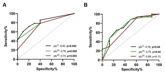 ROC curves for the prediction of AMR gene set levels over the first quartile (AMRQ>1) with different ptc cut-offs, as follows: ptc35%, ptc50%, and ptc extent. Areas under the curve (AUC) were highest with the ptc% in both cohorts. As a threshold, the ptc35% cut-off had higher ROCs compared to the ptc50% in both cohorts. In the validation cohort, only the ptc% and the ptc35% were significantly associated with AMRQ>1. (A) ROCs analyzed in the exploratory cohort; (B) ROCs analyzed in the confirmatory cohort. Bold numbers indicate statistically significant associations. Abbreviations: AMR: antibody-mediated rejection and ptc: peritubular capillaritis.