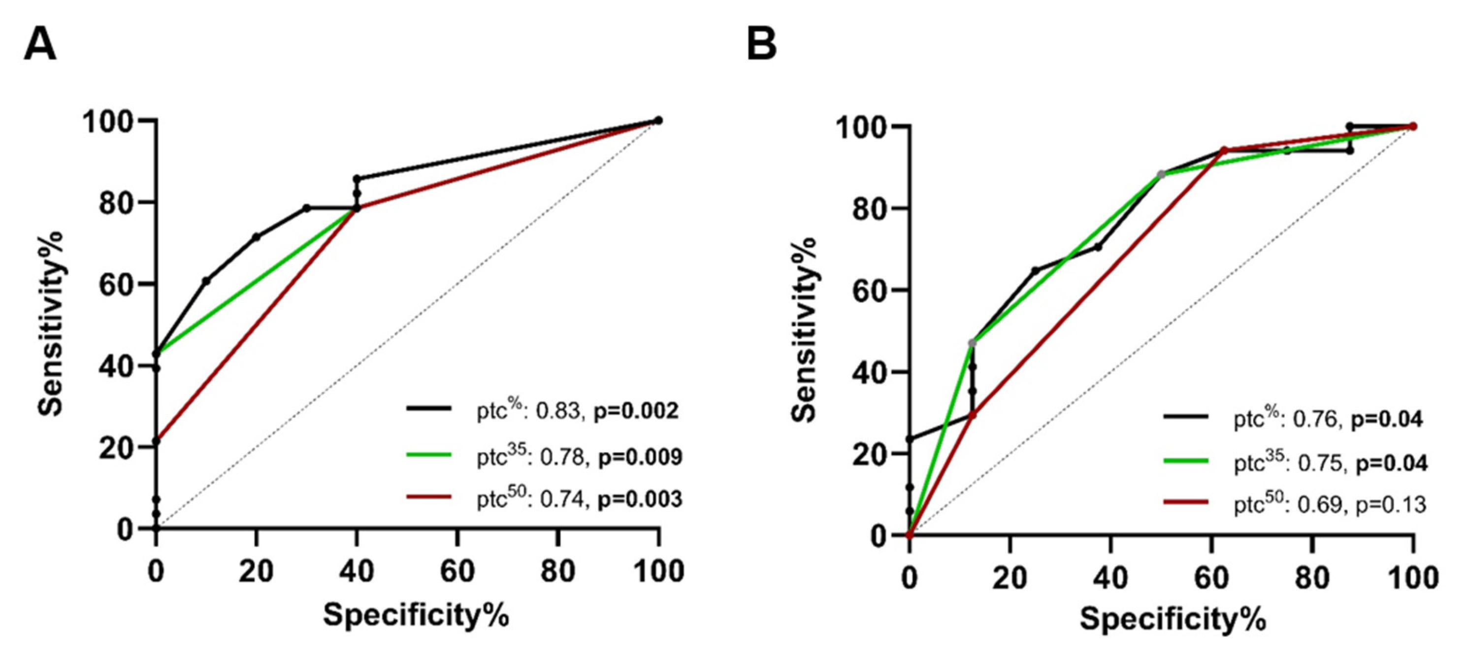 | PTC score | 0.81, CI: 0.67–0.93, p = 0.004 | 0.81, CI: 0.63–0.98, p = 0.02 |