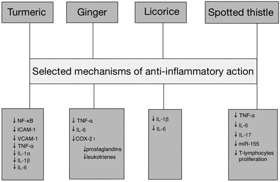 Pathway-based representation of anti-inflammatory actions of Turmeric, Ginger, Licorice, and Spotted thistle. Abbreviations: TNF-α—tumor necrosis factor alpha, IL—interleukin, NF-κB—nuclear factor kappa-light-chain-enhancer of activated B cells, ICAM-1—intercellular adhesion molecule 1, VCAM-1—vascular cell adhesion molecule 1, miR-155—microRNA-155, COX-2—cyclooxygenase, ↓—downregulation.