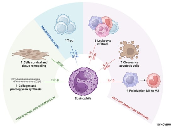 Eosinophils are increasingly recognized for their regulatory role in maintaining immune balance, even within joints and bone. Recent findings suggest their involvement in the resolution of inflammation and local immune modulation. We will now recall some key points. Eosinophils act as tissue-resident immunomodulators. Indeed, beyond their known roles in immune defense, eosinophils reside in various healthy tissues, such as the spleen, gastrointestinal tract, thymus, adipose tissue, and uterus, and are increasingly seen as critical players in sustaining tissue equilibrium. In healthy tissues—most notably in the gastrointestinal tract—eosinophils contribute to tissue maintenance and immunological balance through non-inflammatory, constitutive activity. In the joint tissues, eosinophils appear to influence local immune tone subtly, participating in cellular crosstalk and promoting resolution over escalation. Thus, they help shape a homeostatic microenvironment []. This emerging perspective highlights their significance in sustaining long-term tissue equilibrium, particularly under chronic or subclinical conditions.