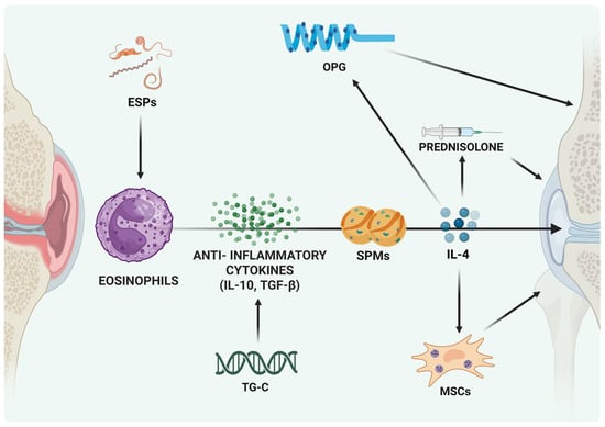 Several studies have highlighted the potential of helminth infections to reduce the severity of arthritis, with the anti-inflammatory cytokine IL-10 emerging as a key mediator of these protective effects [,]. In 2009, it was reported that infection with Schistosoma mansoni significantly attenuated disease in collagen-induced arthritis (CIA), a widely used model of autoimmune arthritis []. The protective effects were associated with decreased levels of pro-inflammatory cytokines such as IL-17A and TNF-α, and increased levels of IL-10. Similarly, Chen et al. showed that infection with Nippostrongylus brasiliensis resulted in Th2 cell and eosinophil accumulation in the joints, leading to reduced arthritis severity and protection from bone loss []. This effect was dependent on IL-4/IL-13-induced STAT6 signaling, with eosinophils contributing by promoting anti-inflammatory macrophage polarization within the joint.