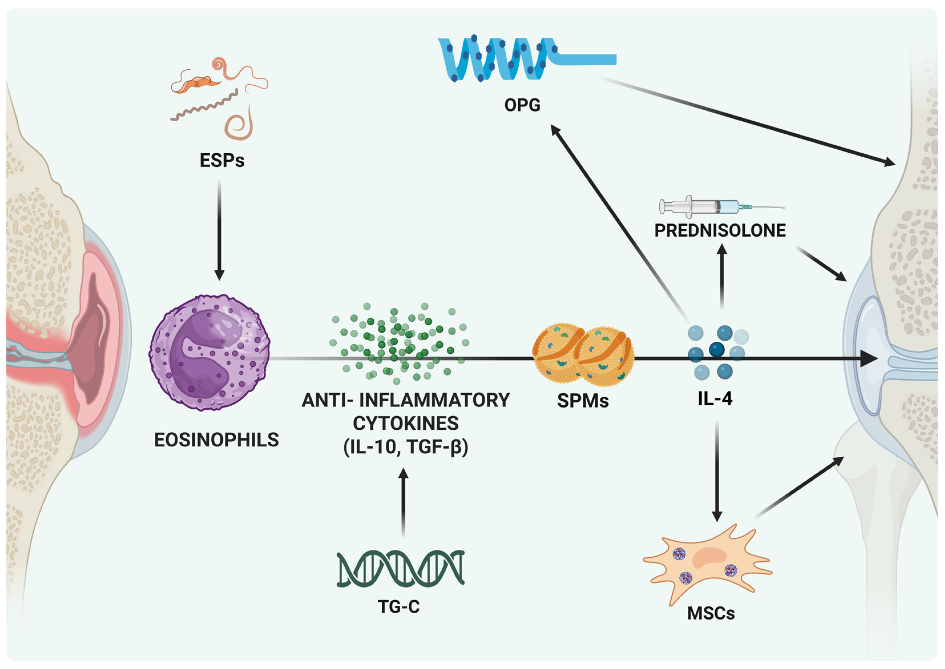 IL-4 and other cytokines produced during helminth-driven immune responses can modulate eosinophil recruitment and activation, potentially contributing to the anti-inflammatory and tissue reparative effects observed in helminth-induced trained immunity. Thus, integrating eosinophil biology with helminth-mediated immune modulation may enhance therapeutic strategies aimed at resolving chronic inflammation and promoting joint tissue regeneration in OA.