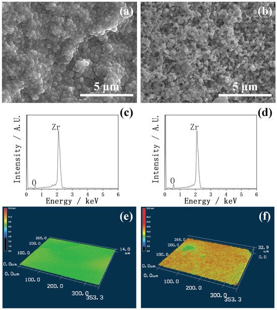 The 3D images further demonstrated the effect of the HF treatment on the YSZ plates in Figure 1e,f. Compared with the untreated surface, which appeared relatively flat and smooth, the HF-treated surface exhibited a much more irregular and roughened morphology, consistent with the morphological features observed in the SEM.