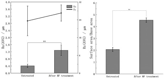 Ra, Rz, and surface area/base area of YSZ plates before and after HF treatment. Ra: average roughness; Rz: maximum roughness depth. The symbol “**” indicates p < 0.01, and the absence of a symbol indicates p > 0.05, as determined by Student’s t-test.