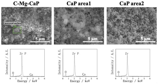 In Figure 4, the coating performances of YSZ plates treated with C-Mg-CaP and CaP m-SBF are shown via SEM and EDX. The C-Mg-CaP m-SBF, which previously demonstrated an excellent coating ability on Zr-50Ti alloys [], was applied to YSZ plates. However, it was found that on YSZ surfaces, C-Mg-CaP m-SBF failed to achieve complete surface coating and exhibited poor precipitation, as shown in the SEM, which significantly differed from its performance on Zr-50Ti alloys. Consequently, the C-Mg-CaP m-SBF was unsuitable for coating YSZ plates. In the EDX, since Zr and P overlapped, it was difficult to distinguish the intensity of P in calcium phosphate. However, from the figure, it is clear that the intensity of Ca is low. Subsequently, CaP m-SBF was applied to YSZ plates. As observed in our previous research [], the CaP m-SBF promoted localized apatite precipitation in some areas of the substrate, while other areas remained completely uncovered, as shown in CaP area 1 and area 2 of Figure 4, resulting in severely non-uniform calcium phosphate coatings. And the EDX also proved the argument that there is a Ca peak in area 1 and absolutely no Ca peak in area 2. This non-uniformity indicates that the CaP m-SBF is also unsuitable for achieving uniform calcium phosphate layers on YSZ plates.