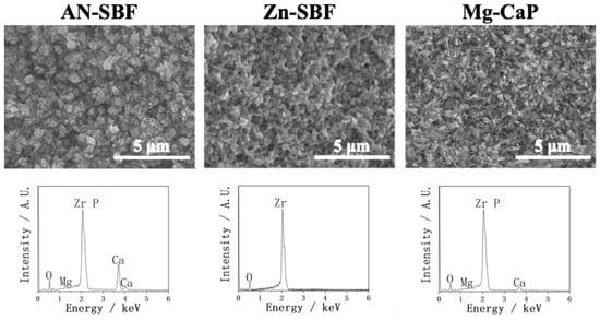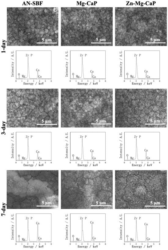 Considering that the CaP, C-Mg-CaP, Zn-SBF, and 2Zn-Mg-CaP m-SBFs were unsuitable for calcium phosphate precipitation on YSZ substrates, only AN-SBF, Mg-CaP, and Zn-Mg-CaP m-SBFs were evaluated for bioactivity. In Figure 7, the calcium phosphate-growing performances of three types of m-SBF-pretreated YSZ plates in standard SBF are shown via SEM and EDX. During the m-SBF pretreatment process, slight differences in the morphology of the calcium phosphate precipitates were observed among group AN-SBF, group Mg-CaP, and group Zn-Mg-CaP. These differences gradually diminished during the SBF soaking, as the calcium phosphate layers grew. Regardless of whether during the m-SBF pretreatment or the subsequent SBF soaking period, the surface morphologies of all three groups tended to exhibit rod-like structures. Furthermore, in the EDX, because the Zn peak overlaps with the Na peak at around 1 keV, and SBF contains a high concentration of NaCl, Zn detection under these conditions was inconclusive due to spectral interference.