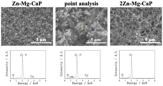 SEM and EDX of YSZ plates pretreated with Zn-Mg-CaP and 2Zn-Mg-CaP m-SBFs. The point analysis is a higher-magnification image of the same location in Zn-Mg-CaP. In “point analysis”, the green dot indicates the measurement location for the point analysis.