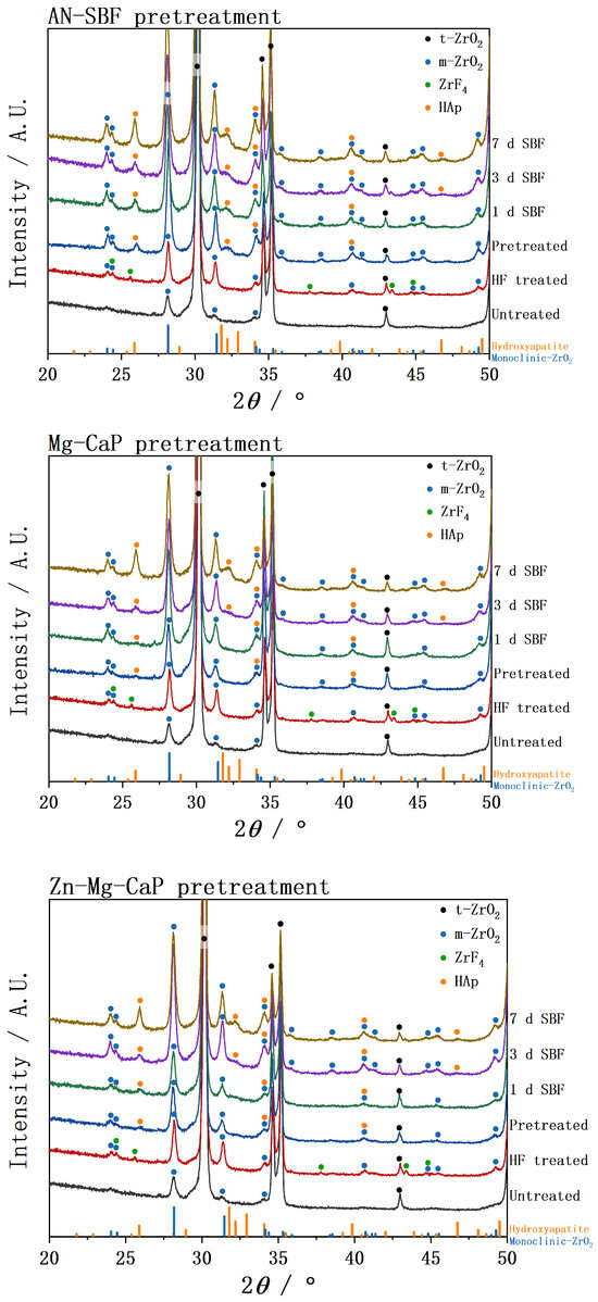 A noticeable increase in the monoclinic phase fraction was detected after both HF and m-SBF treatments, indicating that the t→m transition occurred during these processes. The untreated YSZ exhibited only trace amounts of the monoclinic phase, whereas the HF treatment led to a measurable increase. After m-SBF soaking, all samples showed further t→m transition. Among the three types of m-SBFs, the AN-SBF treatment produced the highest monoclinic phase fraction, followed by Mg-CaP and Zn-Mg-CaP m-SBFs.