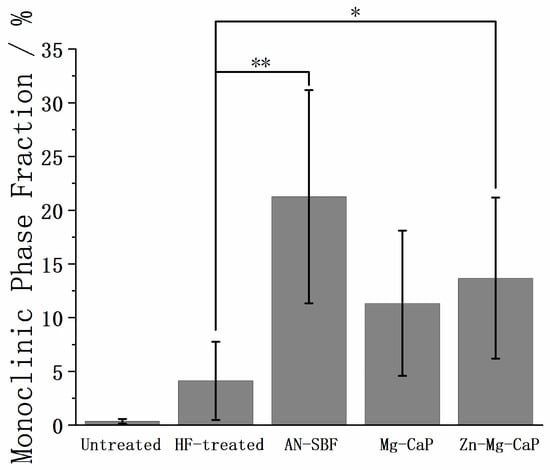 Monoclinic phase fractions of untreated, HF-treated, and three types of m-SBF-pretreated YSZ plates. The symbol “**” indicates p < 0.01, “*” indicates p < 0.05, and the absence of a symbol indicates p > 0.05, as determined by Student’s t-test.