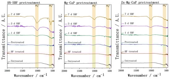 In Figure 10, the FTIR spectra of the untreated, HF-treated, three types of m-SBF-pretreated, and SBF-soaked YSZ plate samples are shown. Compared with group Mg-CaP and group Zn-Mg-CaP, group AN-SBF showed stronger apatite formation from the pretreatment, as evidenced by the P-O bands. During the subsequent standard SBF soaking, these P-O bands increased more rapidly. In contrast, group Mg-CaP and group Zn-Mg-CaP showed comparable FTIR intensities over time; no obvious effect of Zn addition was observed within our detection limits.