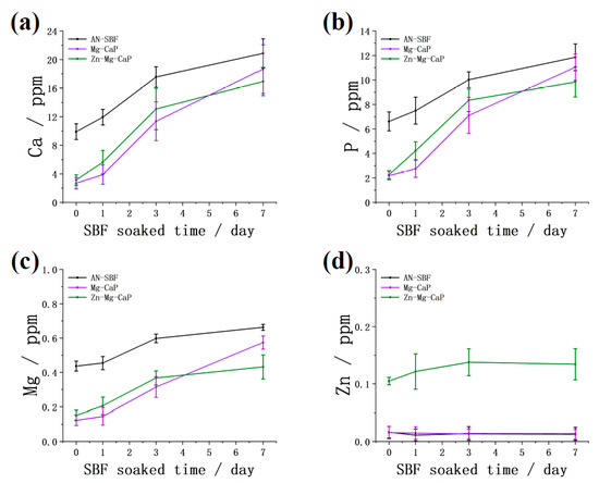 In Figure 11, the Ca, P, Mg, and Zn concentrations of the apatite coatings, which were dissolved in HNO3 solution, are shown. During the pretreatment stage, the Ca, P, and Mg concentrations in group AN-SBF were significantly higher than those of group Mg-CaP and group Zn-Mg-CaP, indicating that more apatite formed. With subsequent soaking in standard SBF, the Ca, P, and Mg concentrations in group Mg-CaP and group Zn-Mg-CaP gradually increased and approached the level of group AN-SBF by 7 days.
