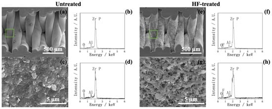 SEM and EDX images of the cross sections of untreated and HF-treated YSZ plates. (a) Low-magnification SEM image of the cross section of an untreated YSZ plate. (b) EDX corresponding to (a). (c) High-magnification SEM image of the green-marked area in (a). (d) EDX corresponding to (c). (e) Low-magnification SEM image of the cross section of an HF-treated YSZ plate. (f) EDX corresponding to (e). (g) High-magnification SEM image of the green-marked area in (e). (h) EDX corresponding to (g).