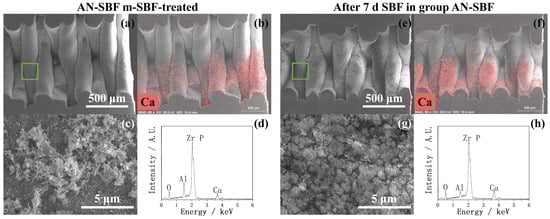 In the EDX mappings shown in Figure 13, Figure 14 and Figure 15, the Ca appears more intense in the lower part of the image compared with the upper part. This uneven intensity mainly results from the 3D pore geometry and the surface inclination, which affect the X-ray detection efficiency, rather than from a real difference in Ca. However, as shown in Figure 13b, the Ca mapping shows a clear difference between the left and right sides of the image; that is, the Ca signal is higher on the outer surface of the pores and much weaker inside. In contrast, other mappings show nearly uniform color intensity, indicating that the uneven apatite deposition between the inner and outer pore appeared only in group AN-SBF during the m-SBF pretreatment and disappeared after 7 days of SBF soaking.