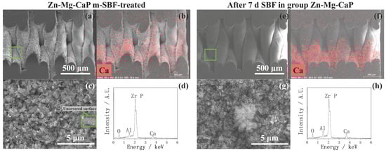 SEM and EDX of the cross sections of Zn-Mg-CaP-pretreated and 7-day SBF-soaked YSZ plates. (a) Low-magnification SEM image of the cross section of a Zn-Mg-CaP-pretreated YSZ plate. (b) EDX mapping corresponding to (a). (c) High-magnification SEM image of the green-marked area in (a). (d) EDX analysis corresponding to (a). (e) Low-magnification SEM image of the cross section of a 7-day SBF-soaked YSZ plate. (f) EDX mapping corresponding to (e). (g) High-magnification SEM image of the green-marked area in (e). (h) EDX analysis corresponding to (e).