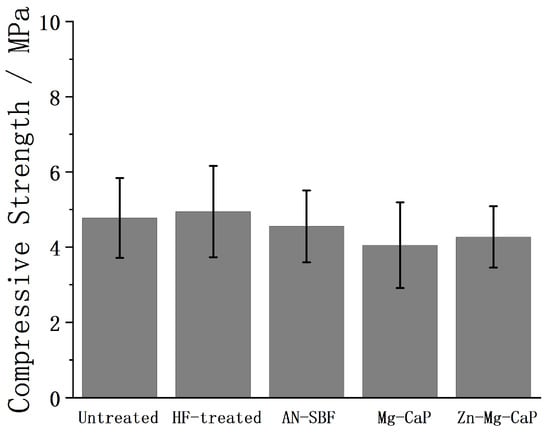 In Figure 16, the compressive strengths of the untreated, HF-treated, and three types of m-SBF–pretreated YSZ plates after 7-day SBF soaking are shown. After 7 days of SBF immersion, a dense apatite layer was observed on the HF-pretreated porous YSZ substrates, accompanied by partial t→m transition detected by XRD. However, the compressive strengths of the samples showed no statistically significant difference compared to the as-prepared substrates, indicating that the apatite deposition did not enhance the mechanical properties and the t→m transition did not impair them.
