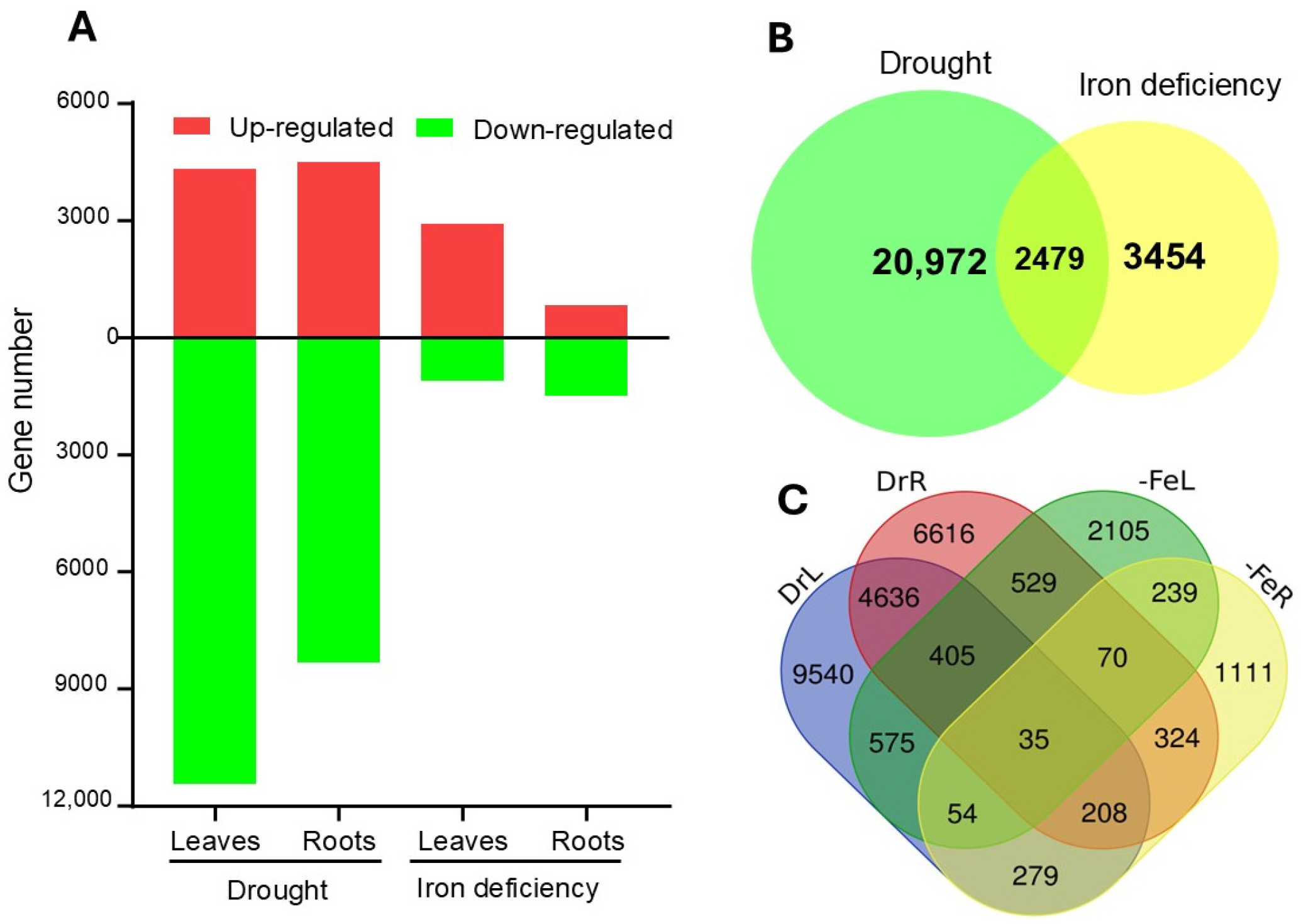 2.1. Identification of DEGs Under Drought and Fe Deficiency