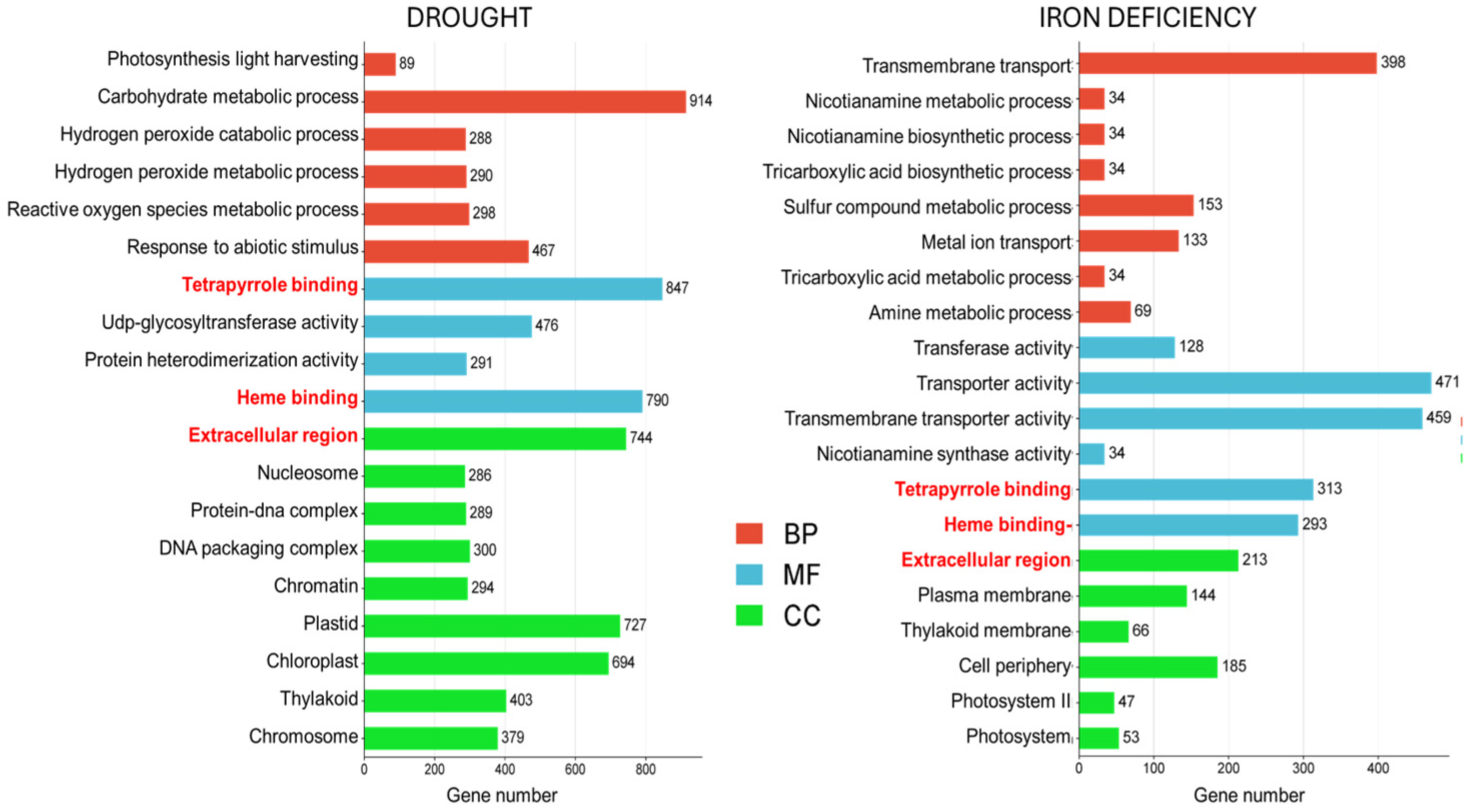 2.2. GO Enrichment Revealed Biological Process Related to Drought and Fe Uptake