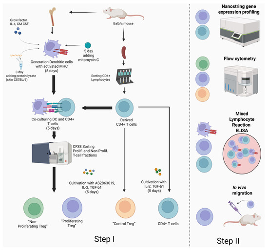 Figure 2. General scheme of experiment. Step I—The process of induction of Ag-Treg and control groups by the AS2863619 compound. Step II—Applied methods for assessing the obtained Ag-Treg by the AS2863619 compound.